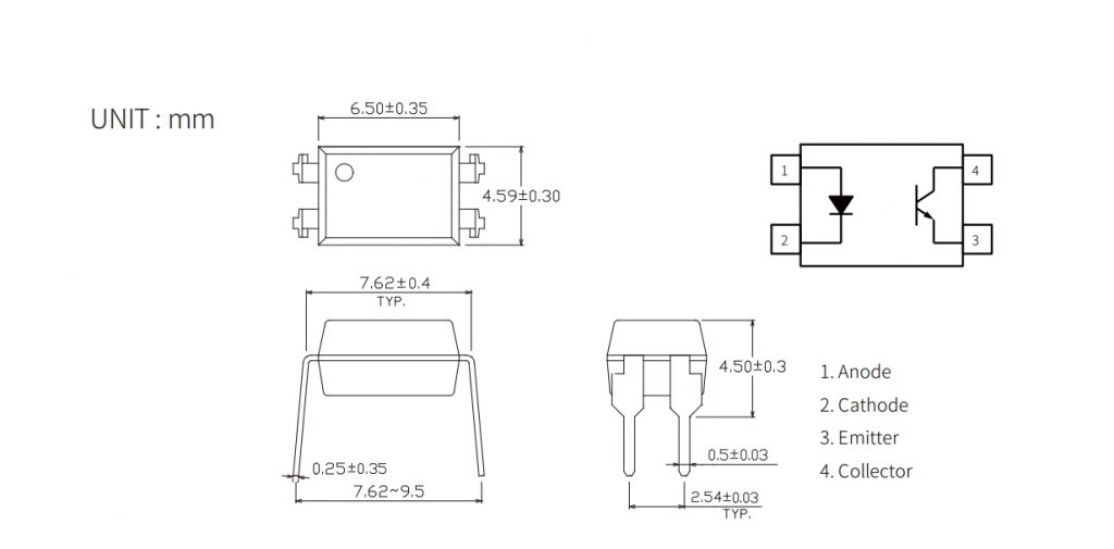 | KL817LT | DIP4 | 6.5x4.59x3.5 | 1.3 | 80 | 0.3 | 0.1 | 50~600 | 8 | 12 | - | - | -55 | +110 | 5000 |